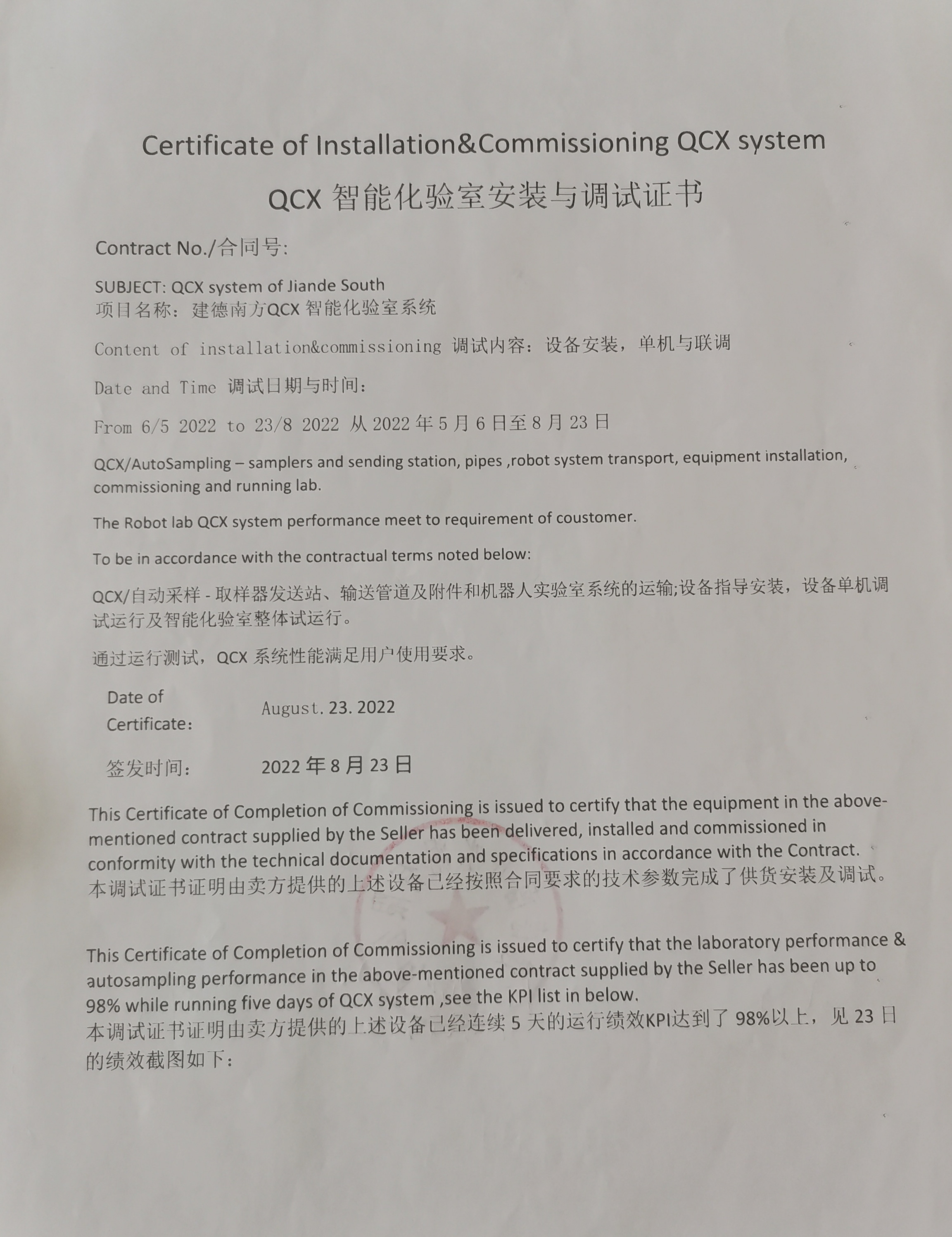 本次QCX系統(tǒng)設(shè)備由HNBMI自行安裝,艾法史密斯公司指導(dǎo)調(diào)試,實驗室建設(shè)過程中,我院項目部合理制定搭建計劃,主動配合業(yè)主生產(chǎn),全力克服疫情難艱,高效完成了本次建造任務(wù),并順利通過了系統(tǒng)的性能測試,客戶給予高度認(rèn)可。