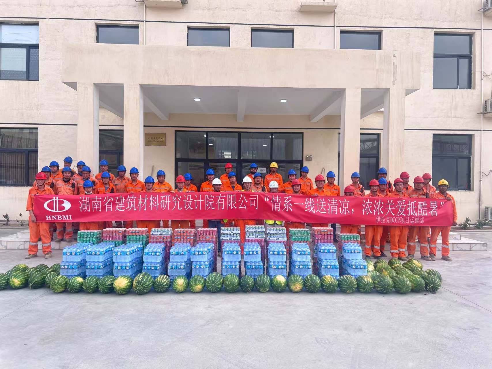 與此同時(shí),正值伊拉克埃爾比勒市夏日,水泥廠生產(chǎn)車間內(nèi)機(jī)器轟鳴,室外設(shè)備區(qū)地表溫度早已突破 48℃。運(yùn)維項(xiàng)目部員工頂著高溫在回轉(zhuǎn)窯、磨機(jī)、輸送帶等關(guān)鍵設(shè)備旁巡檢、調(diào)試,保障生產(chǎn)線穩(wěn)定運(yùn)轉(zhuǎn)。為給高溫下堅(jiān)守的員工送去關(guān)懷,項(xiàng)目部組織了“夏季送清涼”活動(dòng)?;顒?dòng)當(dāng)天,項(xiàng)目部管理人員帶著包含礦泉水、飲料、西瓜、綠豆湯、藿香正氣水等防暑降溫物品的 “清涼物資” 來(lái)到生產(chǎn)現(xiàn)場(chǎng)。在發(fā)放現(xiàn)場(chǎng),項(xiàng)目負(fù)責(zé)人周仕平詳細(xì)詢問(wèn)大家的工作狀態(tài)和身體情況,反復(fù)叮囑高溫作業(yè)時(shí)注意勞逸結(jié)合,嚴(yán)格遵守夏季施工防暑規(guī)定,做好自身防護(hù)。