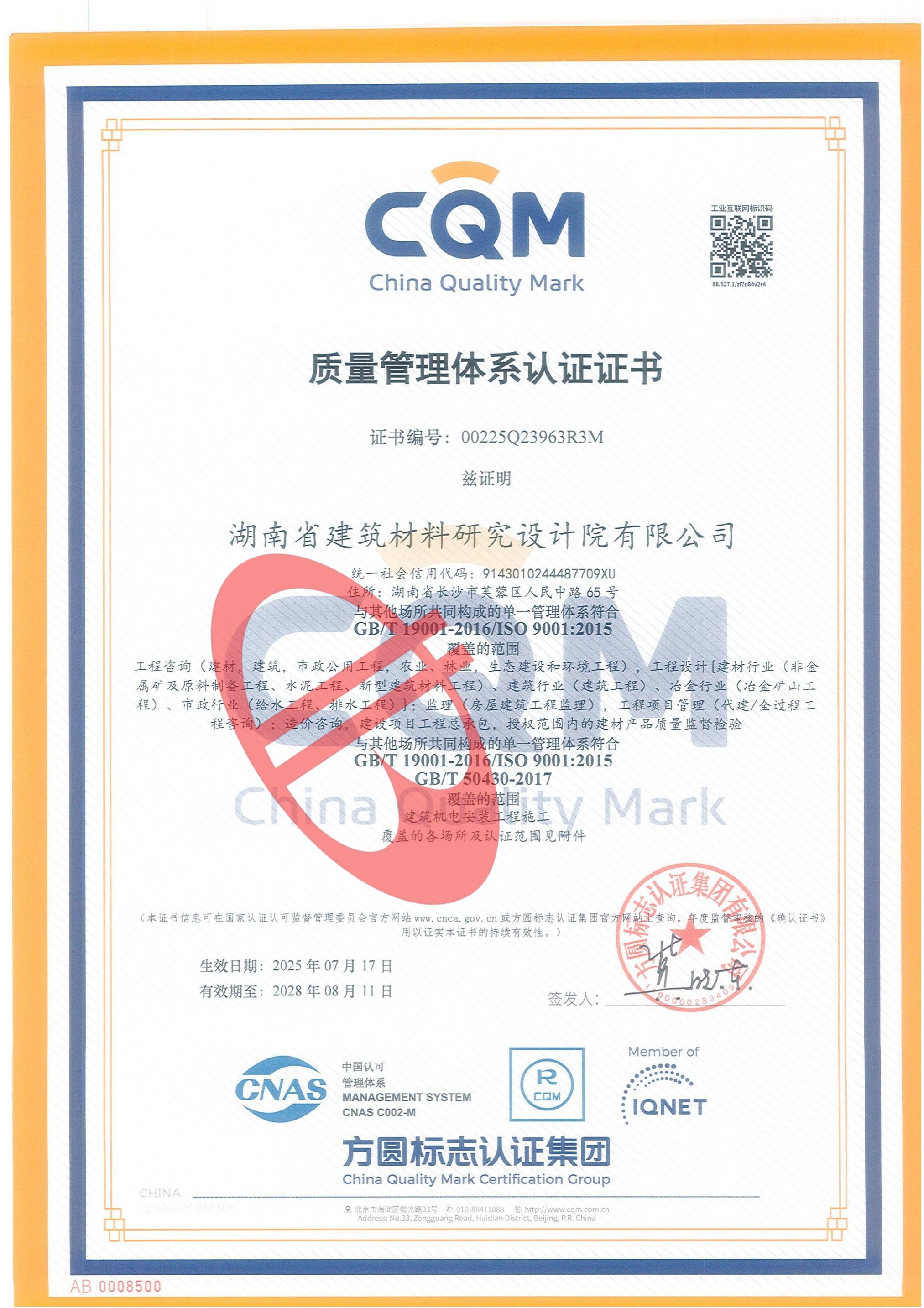 質(zhì)量管理體系認(rèn)證證書