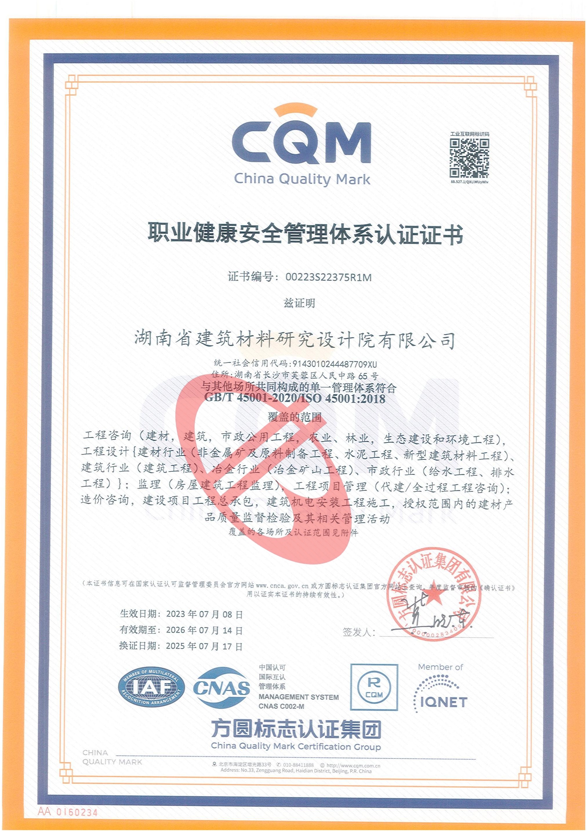 職業(yè)健康安全管理體系認(rèn)證證書